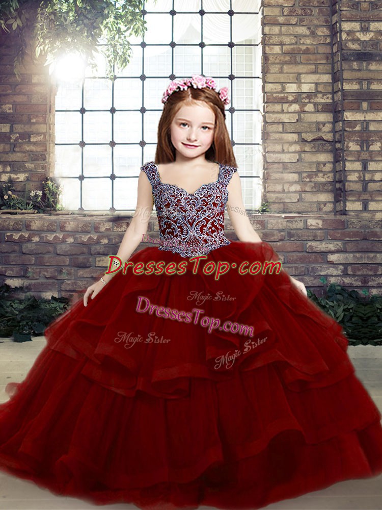 Classical Sleeveless Tulle Floor Length Lace Up Little Girl Pageant Dress in Red with Beading and Ruffles