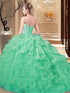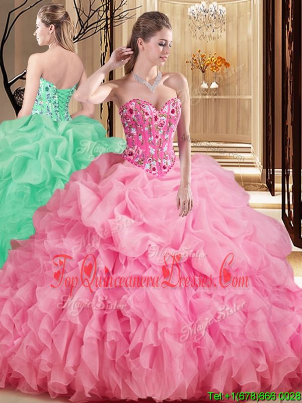 Classical Sweetheart Sleeveless Organza 15th Birthday Dress Embroidery and Ruffles and Pick Ups Brush Train Lace Up