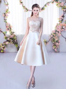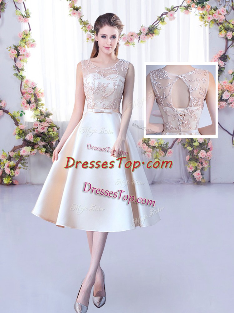 Classical Tea Length Lace Up Quinceanera Court Dresses Champagne for Wedding Party with Lace and Belt
