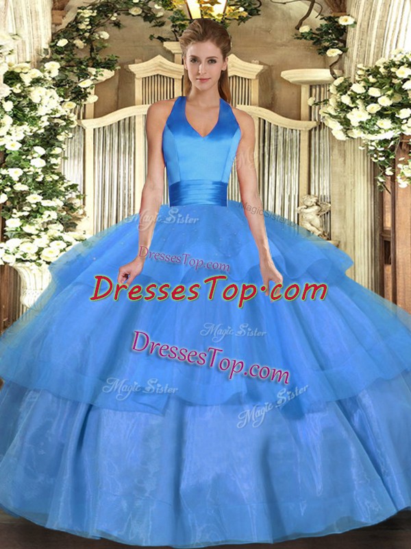 Classical Tulle Halter Top Sleeveless Lace Up Ruffled Layers 15 Quinceanera Dress in Baby Blue