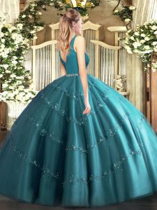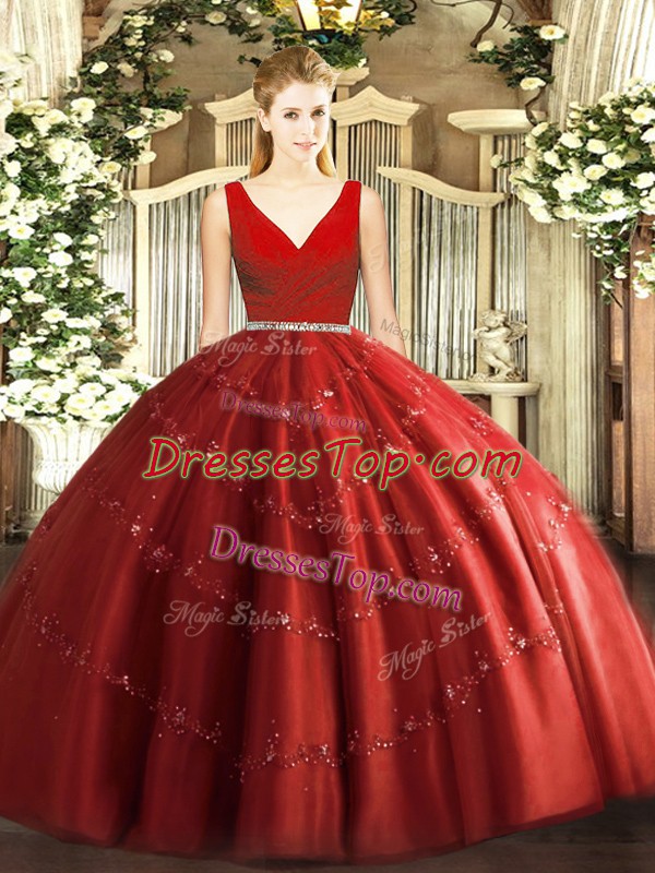 Classical Wine Red Ball Gowns Tulle V-neck Sleeveless Beading Floor Length Zipper Quinceanera Dress