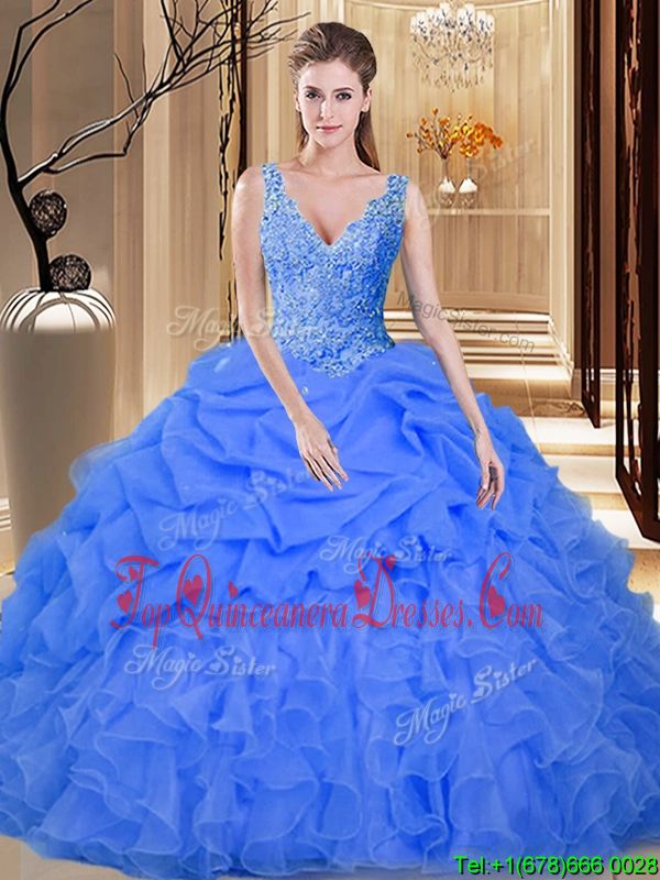 Clearance Backless V-neck Sleeveless 15th Birthday Dress Floor Length Lace and Appliques and Ruffles and Pick Ups Blue Organza