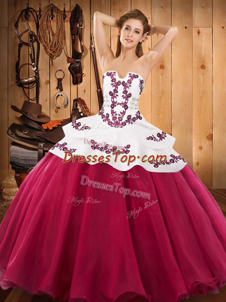 Clearance Floor Length Lace Up Ball Gown Prom Dress Hot Pink for Military Ball and Sweet 16 and Quinceanera with Embroidery