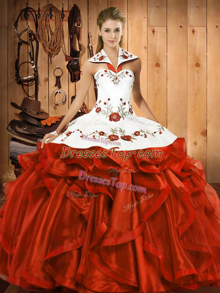 Clearance Floor Length Rust Red Quinceanera Gowns Satin and Organza Sleeveless Embroidery and Ruffles