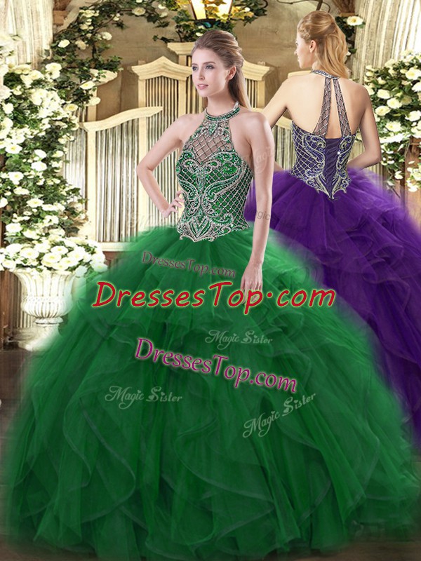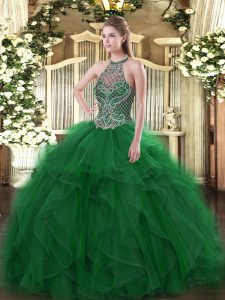 Clearance Green Halter Top Lace Up Beading and Ruffles Vestidos de Quinceanera Sleeveless