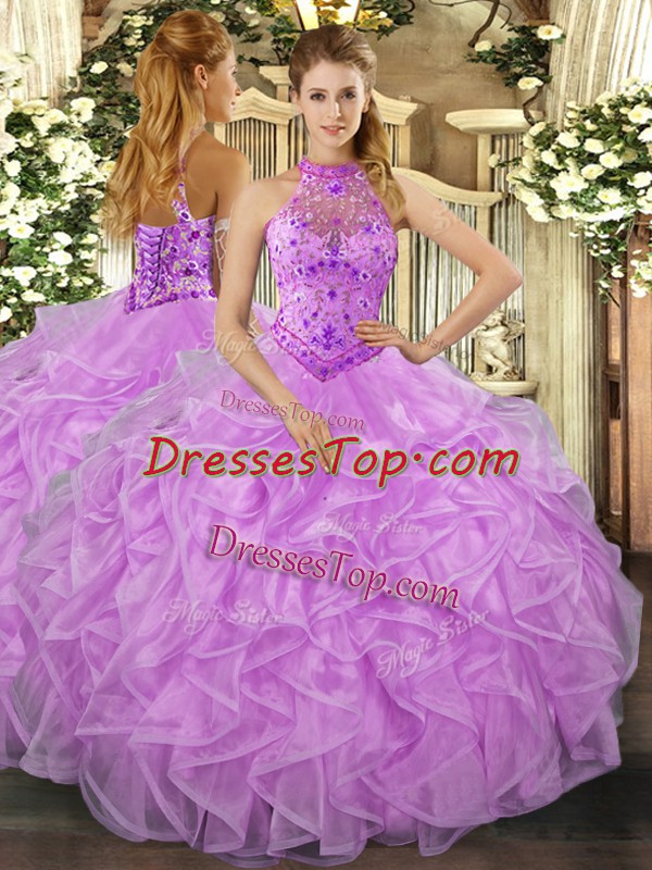 Clearance Lavender Organza Lace Up Sweet 16 Dresses Sleeveless Floor Length Beading and Ruffles