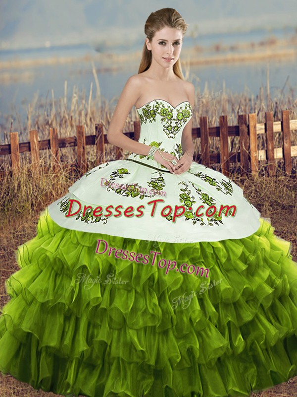 Clearance Olive Green Ball Gowns Sweetheart Sleeveless Organza Floor Length Lace Up Embroidery and Ruffled Layers and Bowknot 15th Birthday Dress