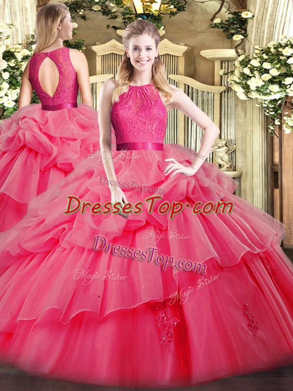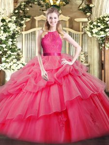 Clearance Scoop Sleeveless Quinceanera Gowns Floor Length Lace and Ruffled Layers Coral Red Organza
