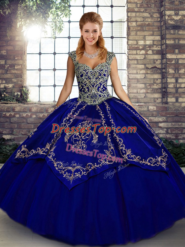 Clearance Sleeveless Tulle Floor Length Lace Up Sweet 16 Quinceanera Dress in Blue with Beading and Embroidery