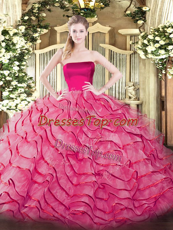 Clearance Strapless Sleeveless Quinceanera Gowns Brush Train Ruffled Layers Hot Pink Tulle