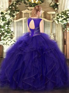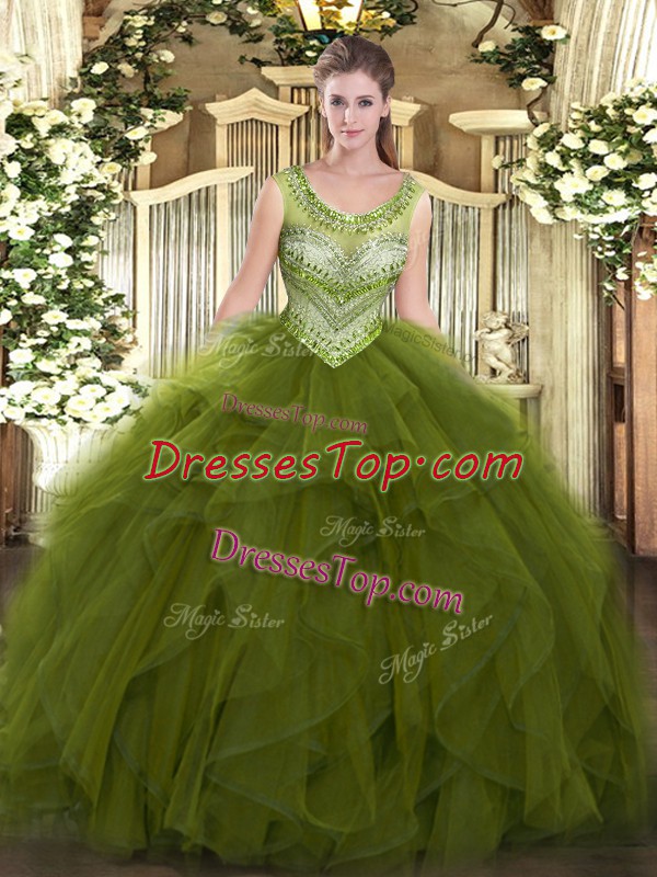 Clearance Tulle Scoop Sleeveless Lace Up Beading and Ruffles Quinceanera Dress in Olive Green