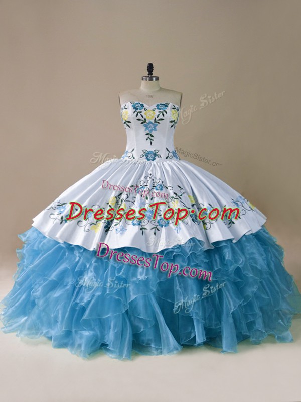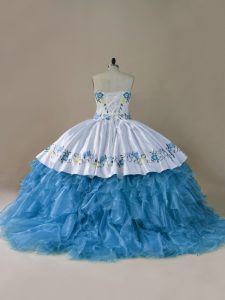 Colorful Blue Sleeveless Floor Length Embroidery and Ruffles Lace Up Sweet 16 Quinceanera Dress