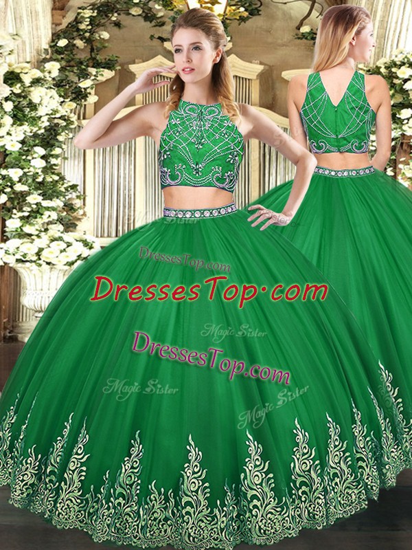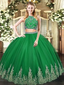 Colorful Dark Green Tulle Zipper High-neck Sleeveless Floor Length Sweet 16 Quinceanera Dress Beading and Ruffles