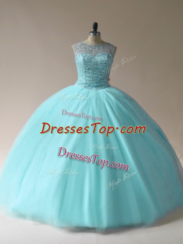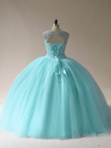 Colorful Sleeveless Floor Length Beading Lace Up Quinceanera Gown with Aqua Blue
