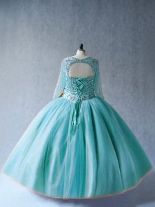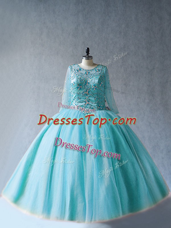 Comfortable Aqua Blue Ball Gowns Tulle Scoop Long Sleeves Beading Floor Length Lace Up Quince Ball Gowns