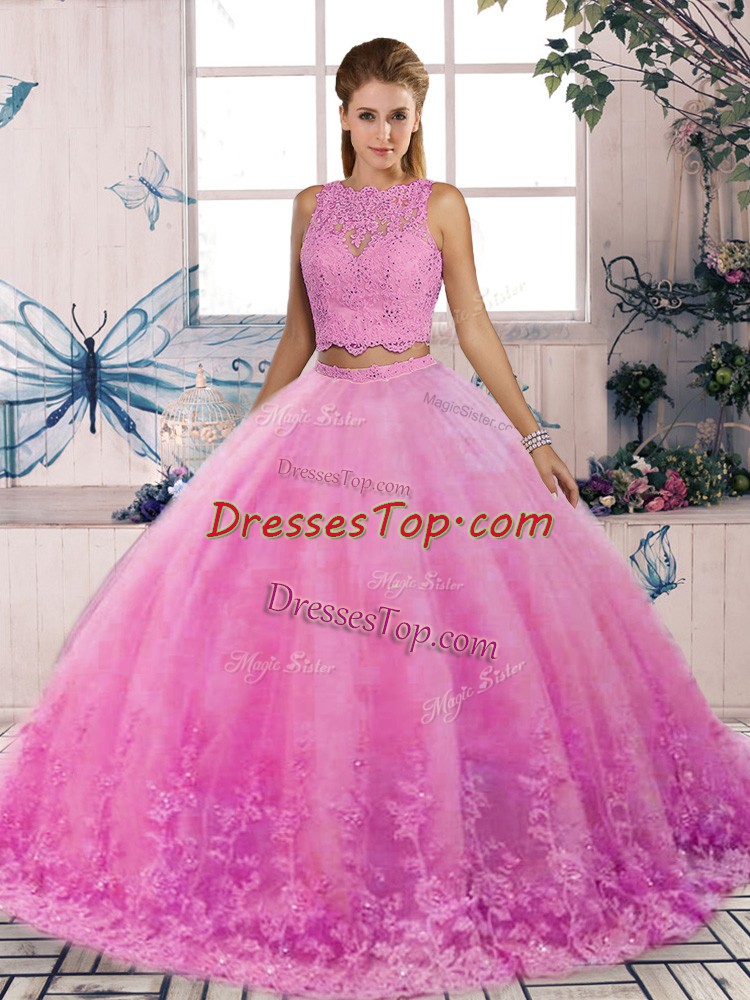 Comfortable Backless Sweet 16 Quinceanera Dress Rose Pink for Military Ball and Sweet 16 and Quinceanera with Lace Sweep Train
