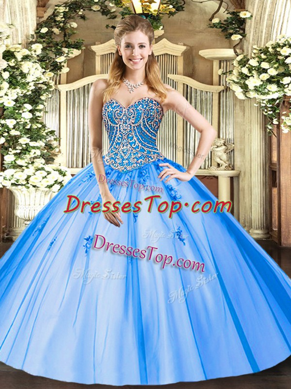 Comfortable Beading and Appliques Quinceanera Dress Blue Lace Up Sleeveless Floor Length