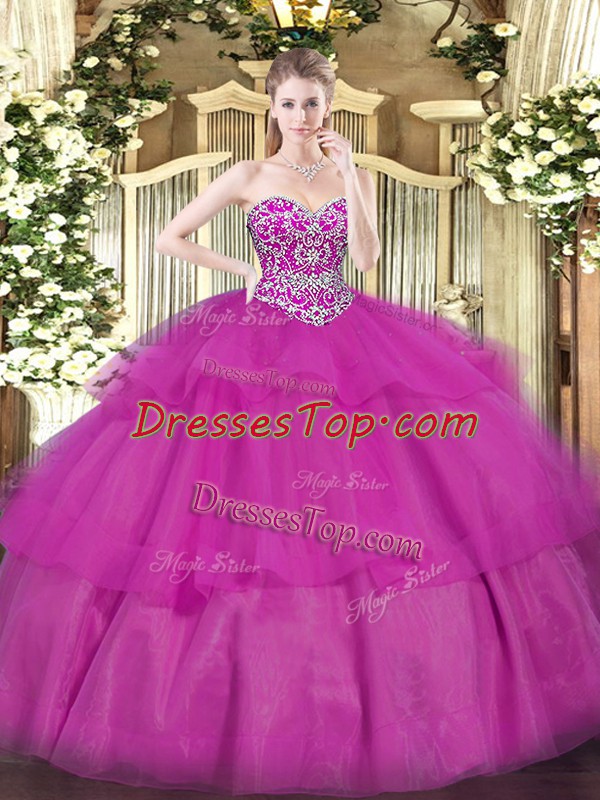Comfortable Floor Length Lace Up Quinceanera Dresses Fuchsia for Military Ball and Sweet 16 and Quinceanera with Beading and Ruffled Layers
