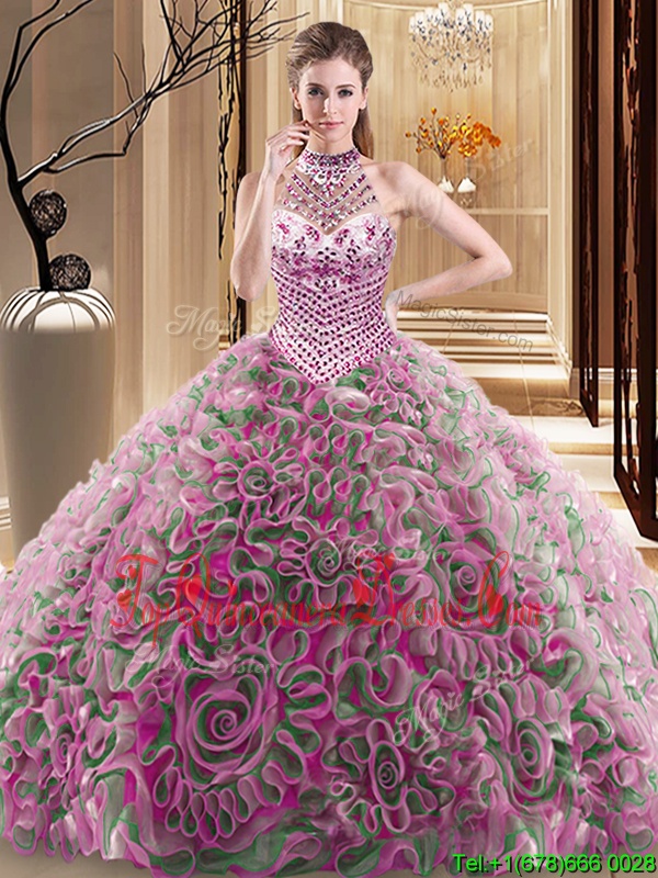 Comfortable Halter Top Multi-color Sleeveless Fabric With Rolling Flowers Brush Train Lace Up Quinceanera Dama Dress for Military Ball and Sweet 16 and Quinceanera