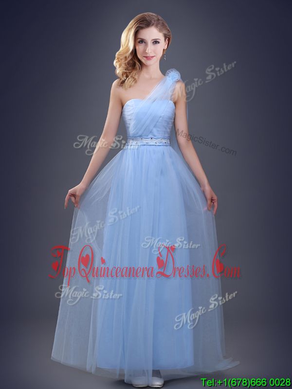 Comfortable One Shoulder Sleeveless Quinceanera Court of Honor Dress Floor Length Beading and Ruching and Hand Made Flower Light Blue Tulle