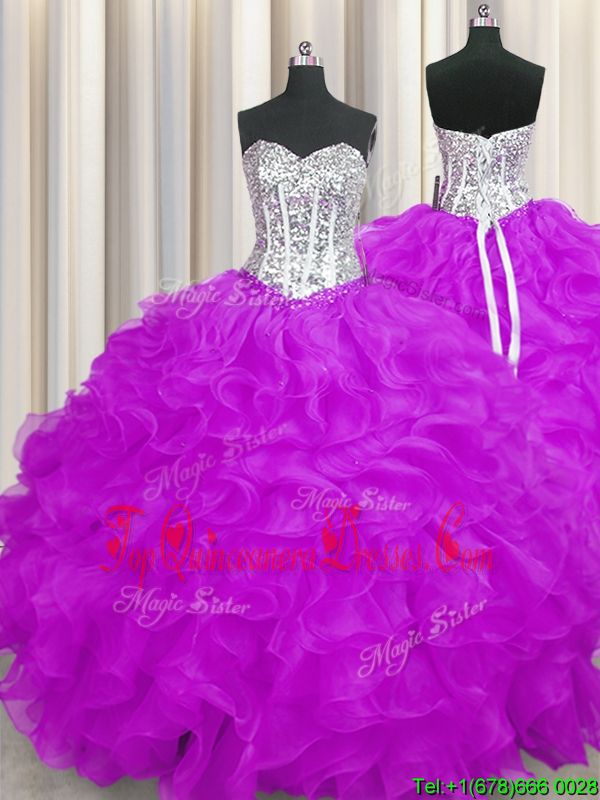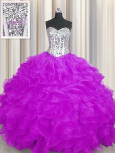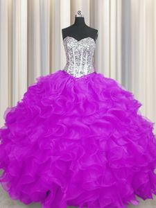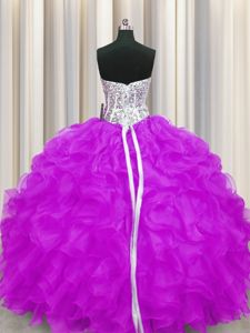 Comfortable Organza Sweetheart Sleeveless Lace Up Beading and Ruffles Ball Gown Prom Dress in Purple