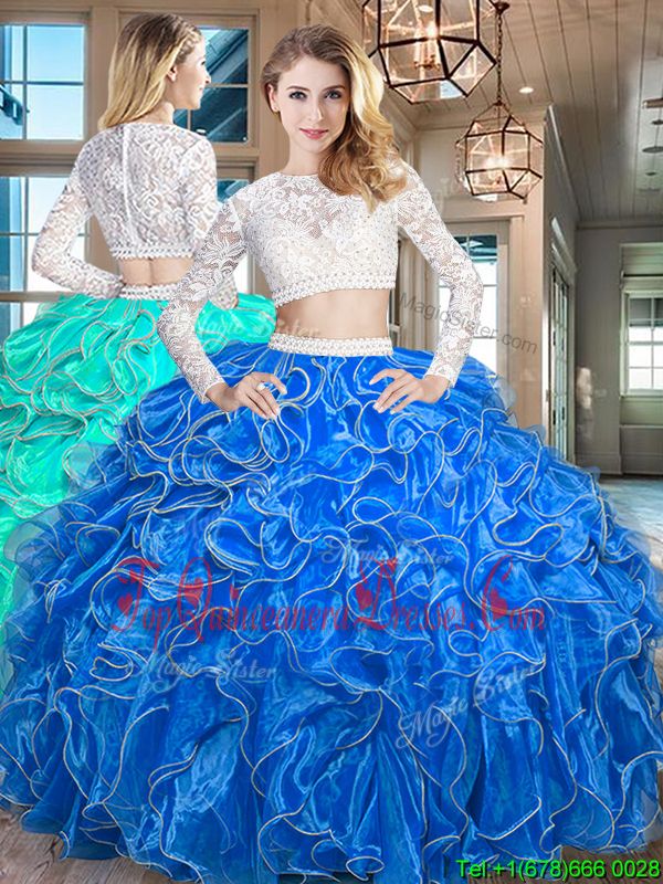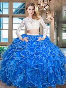 Comfortable Scoop Royal Blue Long Sleeves Floor Length Beading and Lace and Ruffles Zipper 15 Quinceanera Dress