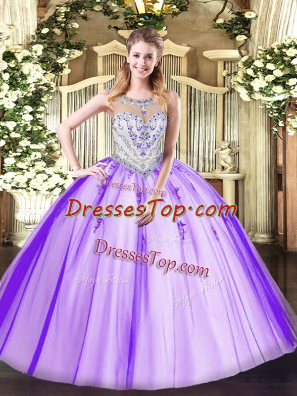 Comfortable Scoop Sleeveless Zipper Quinceanera Gown Lavender Tulle