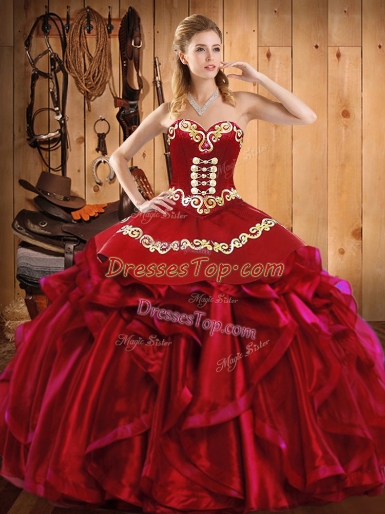 Comfortable Wine Red Sweetheart Lace Up Embroidery and Ruffles Quinceanera Gowns Sleeveless