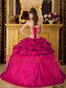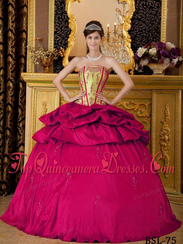 Coral Red Ball Gown Strapless Floor-length Appliques Taffeta Cheap Quinceanera Dress