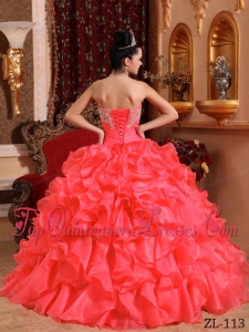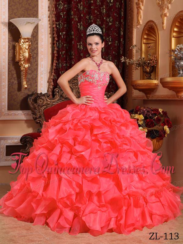 Coral Red Ball Gown Strapless Floor-length Organza Beading and Appliques Quinceanera Dress