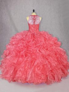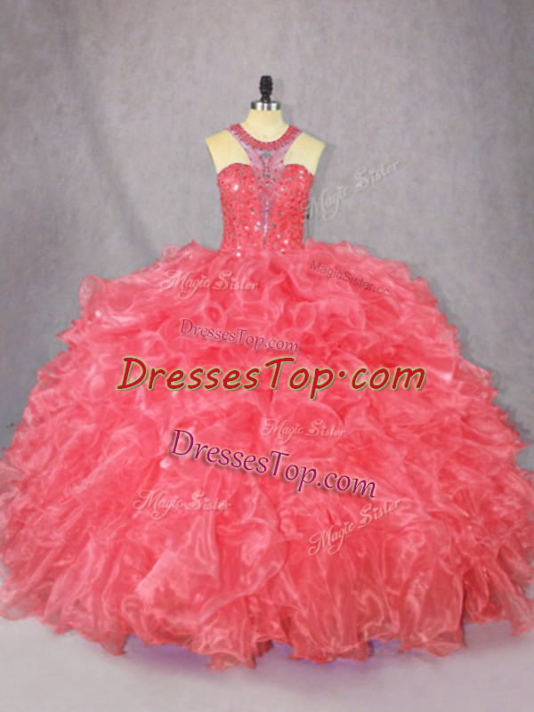 Coral Red Ball Gowns Beading and Ruffles Ball Gown Prom Dress Zipper Organza Sleeveless Floor Length