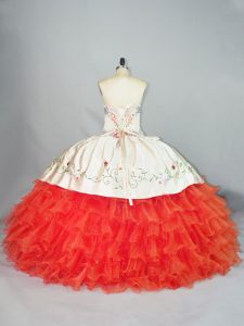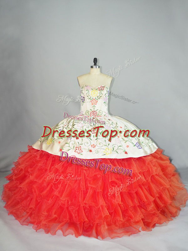 Coral Red Ball Gowns Organza Sweetheart Sleeveless Embroidery and Ruffles Floor Length Lace Up Sweet 16 Dress