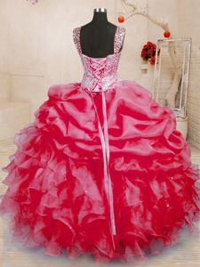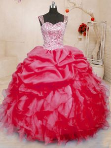 Coral Red Lace Up Straps Beading and Ruffles and Pick Ups 15 Quinceanera Dress Organza Sleeveless