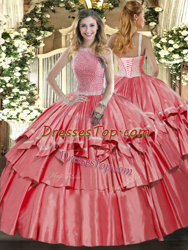Coral Red Organza and Taffeta Lace Up High-neck Sleeveless Floor Length Sweet 16 Quinceanera Dress Beading and Ruffled Layers