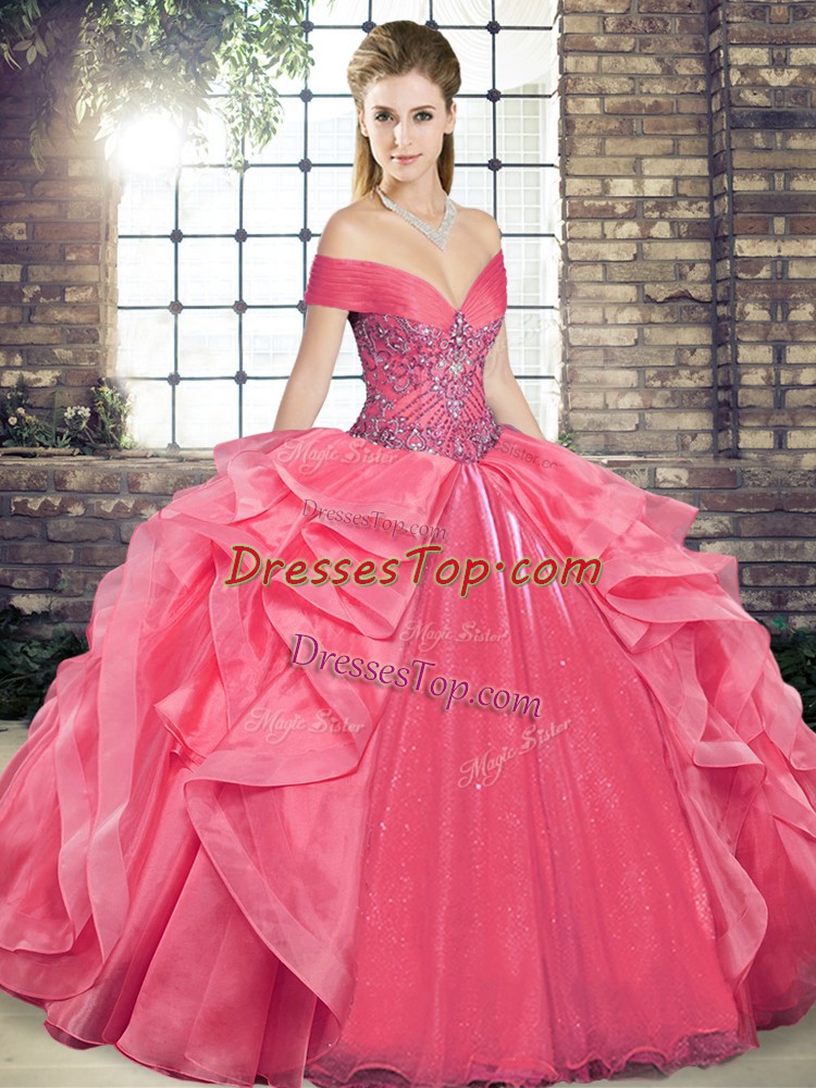 Coral Red Organza Lace Up Off The Shoulder Sleeveless Floor Length Sweet 16 Dresses Beading and Ruffles