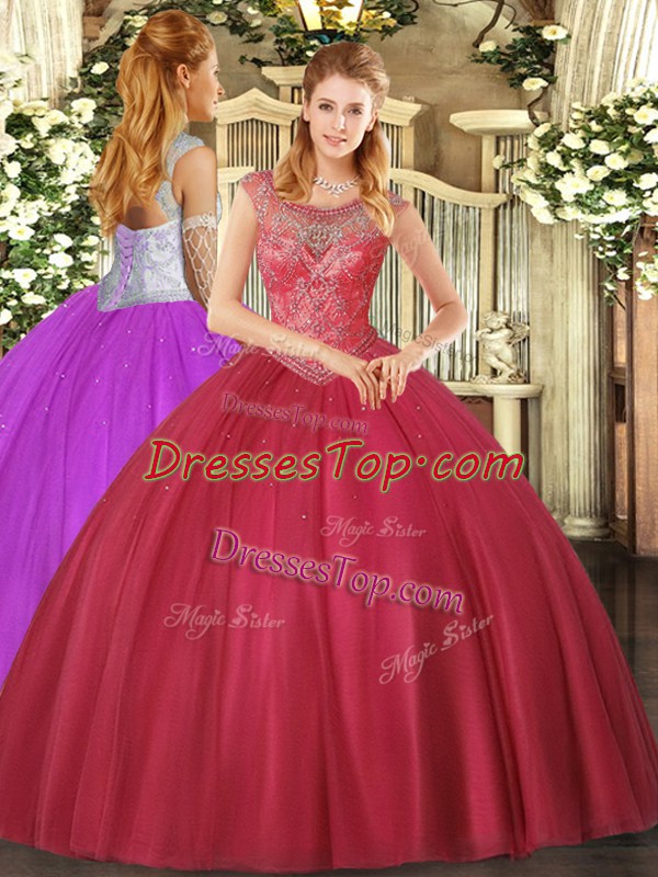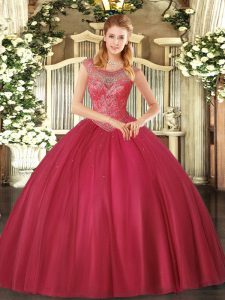 Coral Red Scoop Neckline Beading Quinceanera Dresses Sleeveless Lace Up
