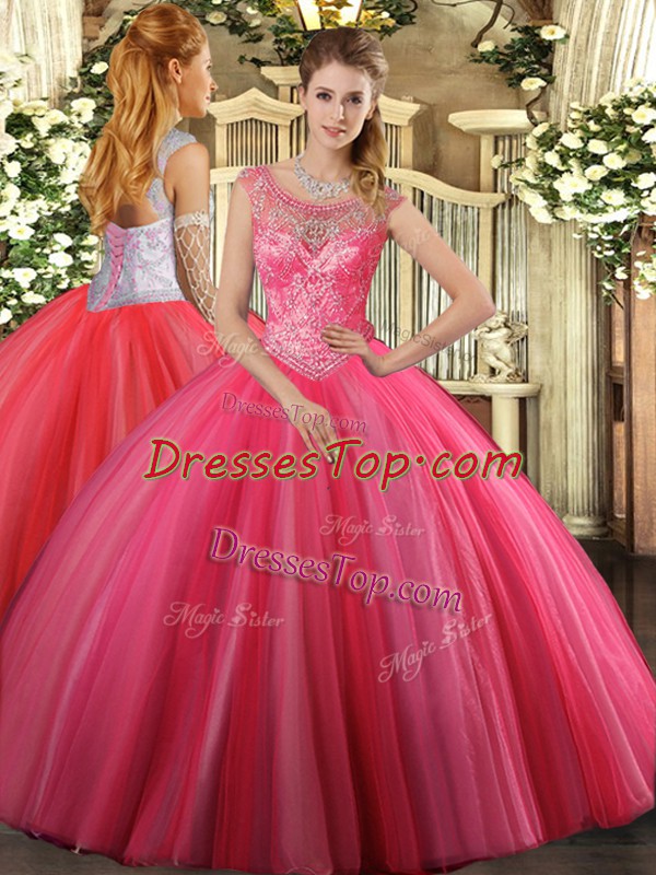 Coral Red Scoop Neckline Beading Quinceanera Gown Sleeveless Lace Up