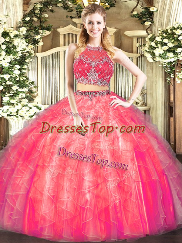 Coral Red Sleeveless Tulle Zipper Quince Ball Gowns for Military Ball and Sweet 16 and Quinceanera