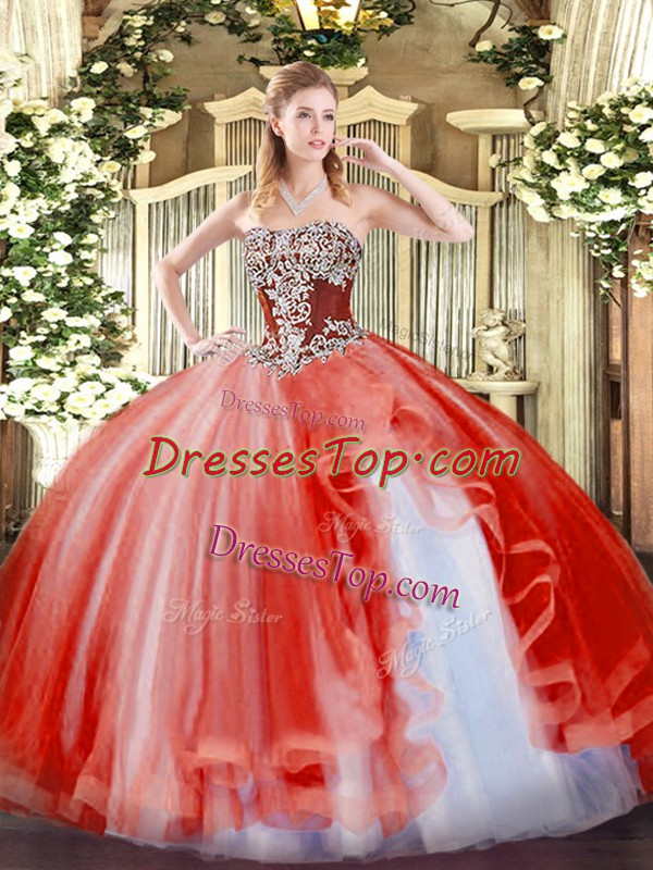 Coral Red Strapless Lace Up Beading and Ruffles 15 Quinceanera Dress Sleeveless