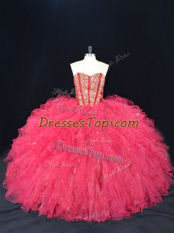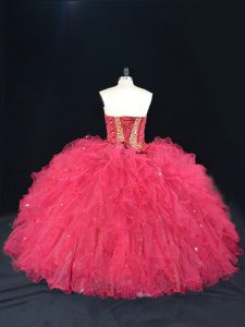 Coral Red Sweetheart Lace Up Beading and Ruffles Quinceanera Gowns Sleeveless