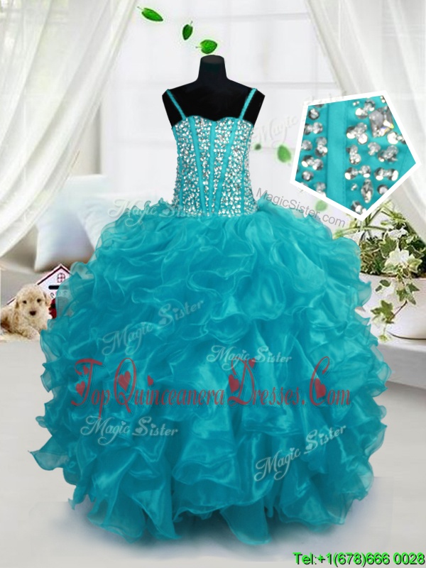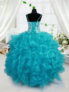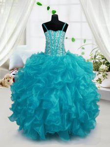 Custom Design Aqua Blue Spaghetti Straps Lace Up Beading and Ruffles Little Girls Pageant Dress Sleeveless