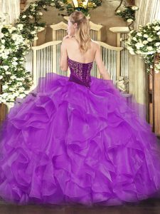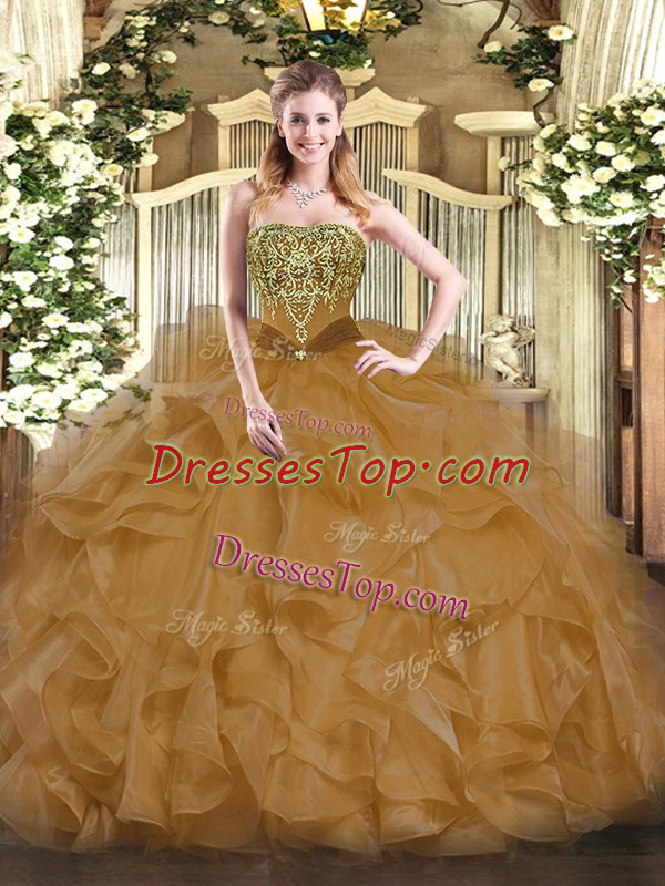 Custom Design Brown Ball Gowns Strapless Sleeveless Organza Floor Length Lace Up Beading and Ruffles Quinceanera Dresses