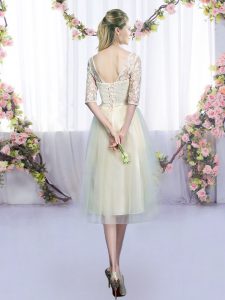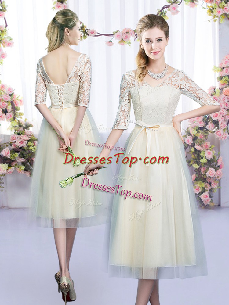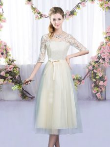 Custom Design Champagne Half Sleeves Tulle Lace Up Quinceanera Court Dresses for Wedding Party