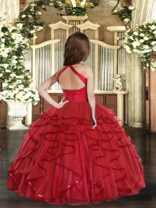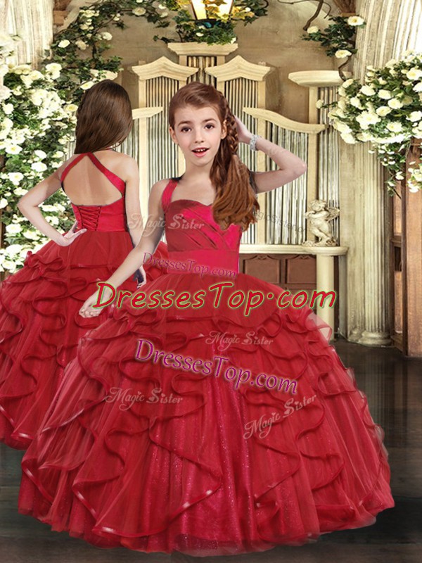 Custom Design Floor Length Lace Up Child Pageant Dress Red for Party and Wedding Party with Ruffles