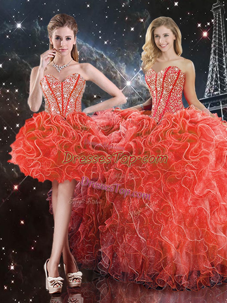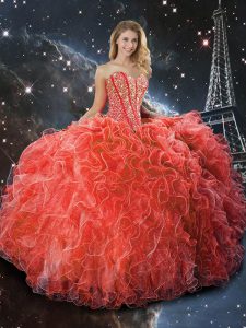 Custom Design Floor Length Lace Up Sweet 16 Quinceanera Dress Coral Red for Military Ball and Sweet 16 and Quinceanera with Beading and Ruffles