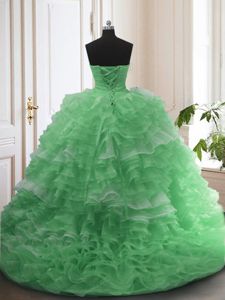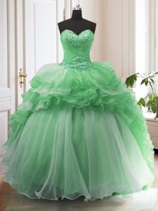 Custom Design Green Organza Lace Up Ball Gown Prom Dress Sleeveless Sweep Train Beading and Ruffled Layers