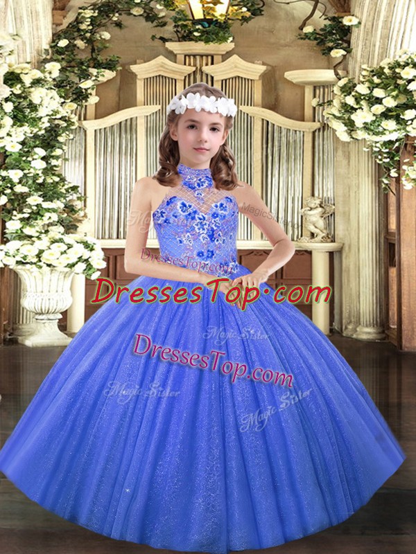 Custom Design Halter Top Sleeveless Lace Up Kids Pageant Dress Blue Tulle