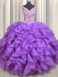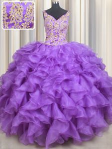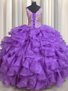 Custom Design Purple Sleeveless Floor Length Beading and Appliques and Ruffles Lace Up 15th Birthday Dress