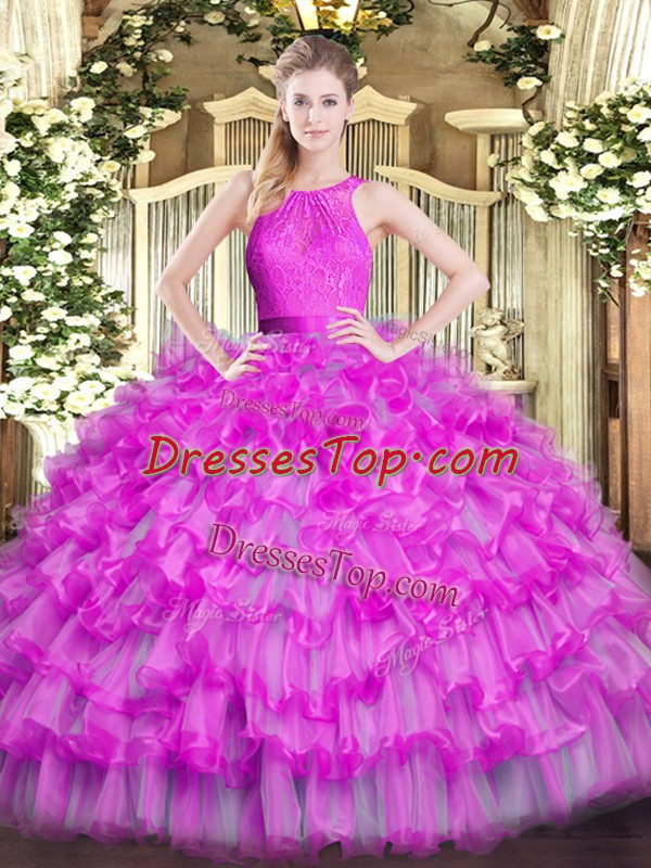 Custom Design Sleeveless Organza Floor Length Zipper Ball Gown Prom Dress in Fuchsia with Ruffled Layers
