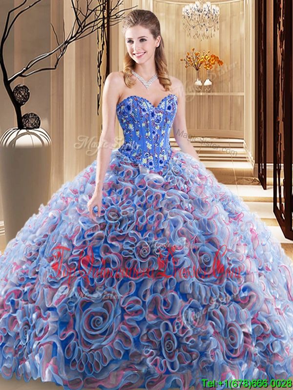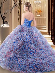 Custom Design Sweetheart Sleeveless Brush Train Lace Up Quince Ball Gowns Multi-color Fabric With Rolling Flowers